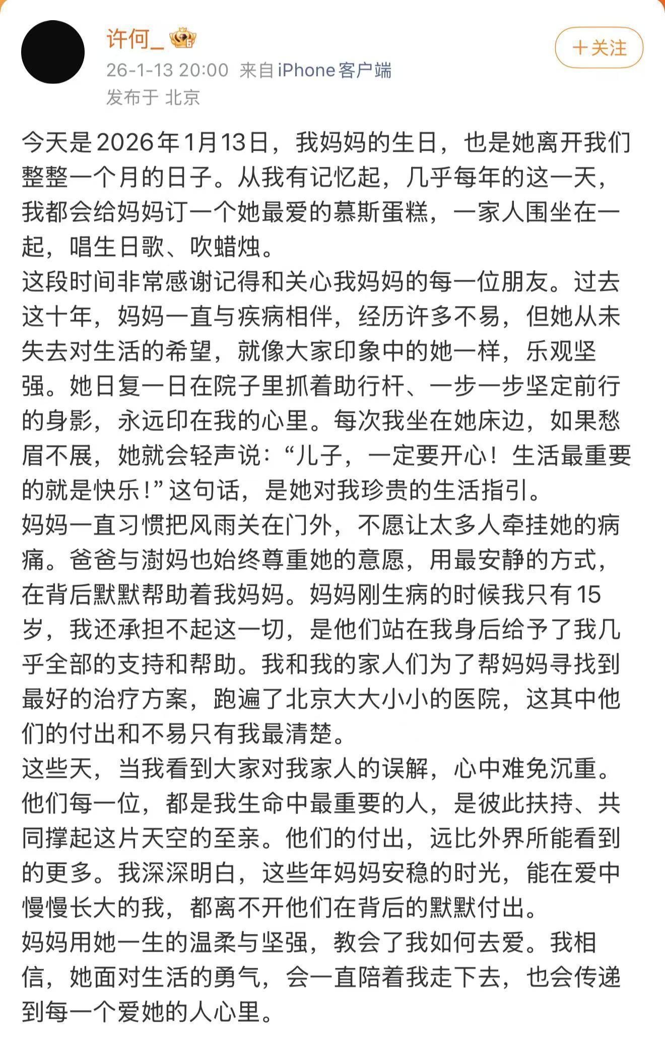 其实最让人心疼的是许何自己。刚经历丧母之痛,转头还得替家人澄清误会。他挑在妈妈生日这天发声,大概也是想用一种温柔的方式,既纪念母亲,又护住还在身边的人。