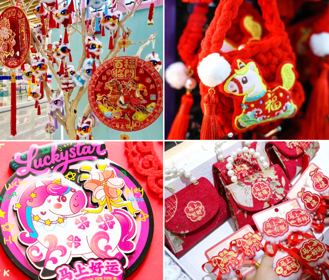 义乌国际商贸城年味儿满满,年画、灯笼、马年玩偶,还有各式各样的创意潮玩年货,铺天盖地的“中国红”,热热闹闹。